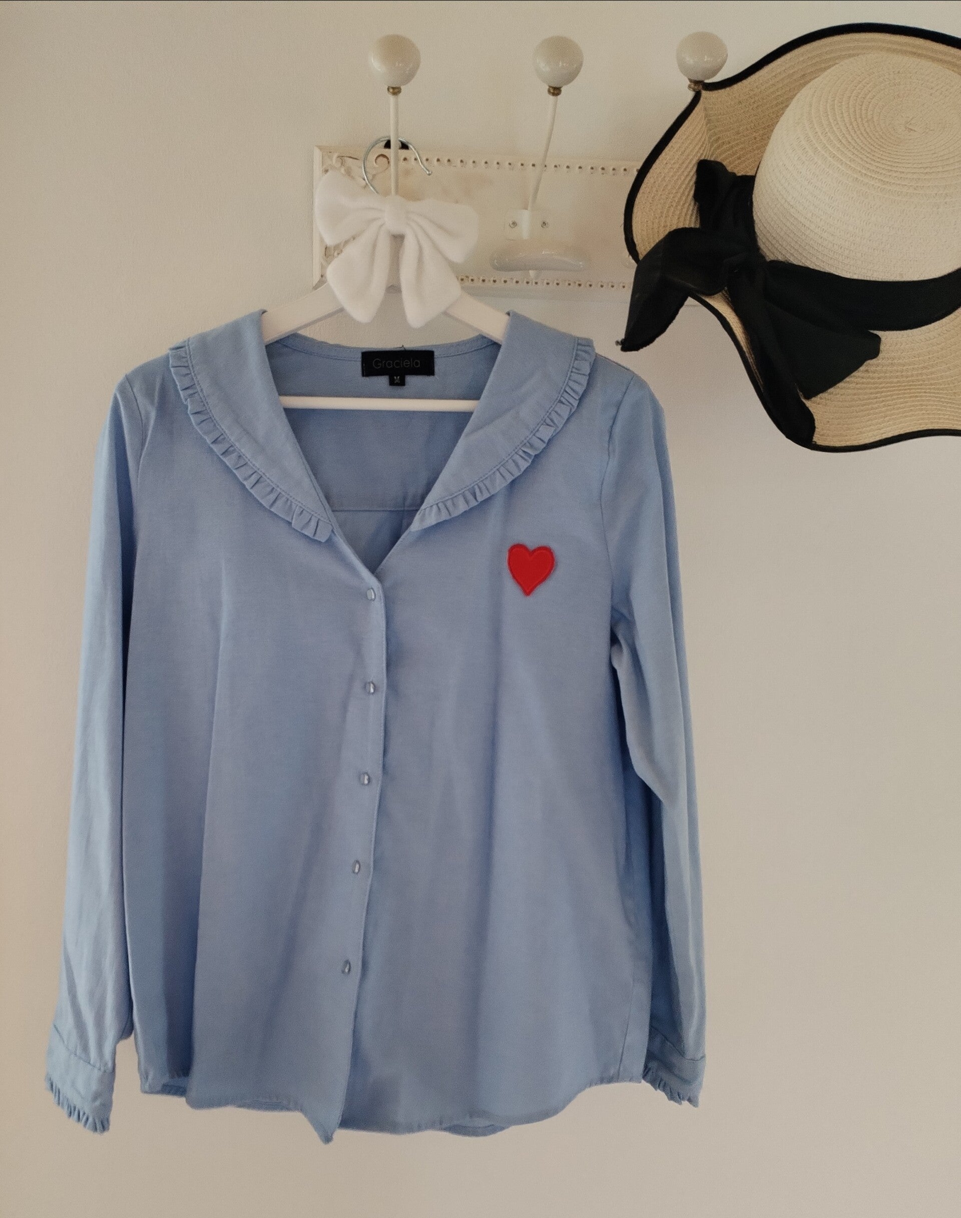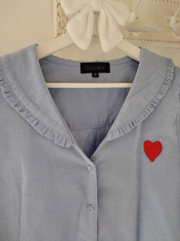 En coton, bleu ciel avec son petit coeur brodé et son col châle